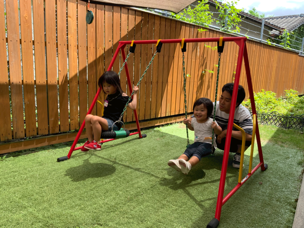 全体での活動の後は、満3歳児保育室の中庭で遊びました。いつの間にか子ども同士一緒に遊んでいる様子を保護者の方も嬉しそうに見守ってくださいました。
