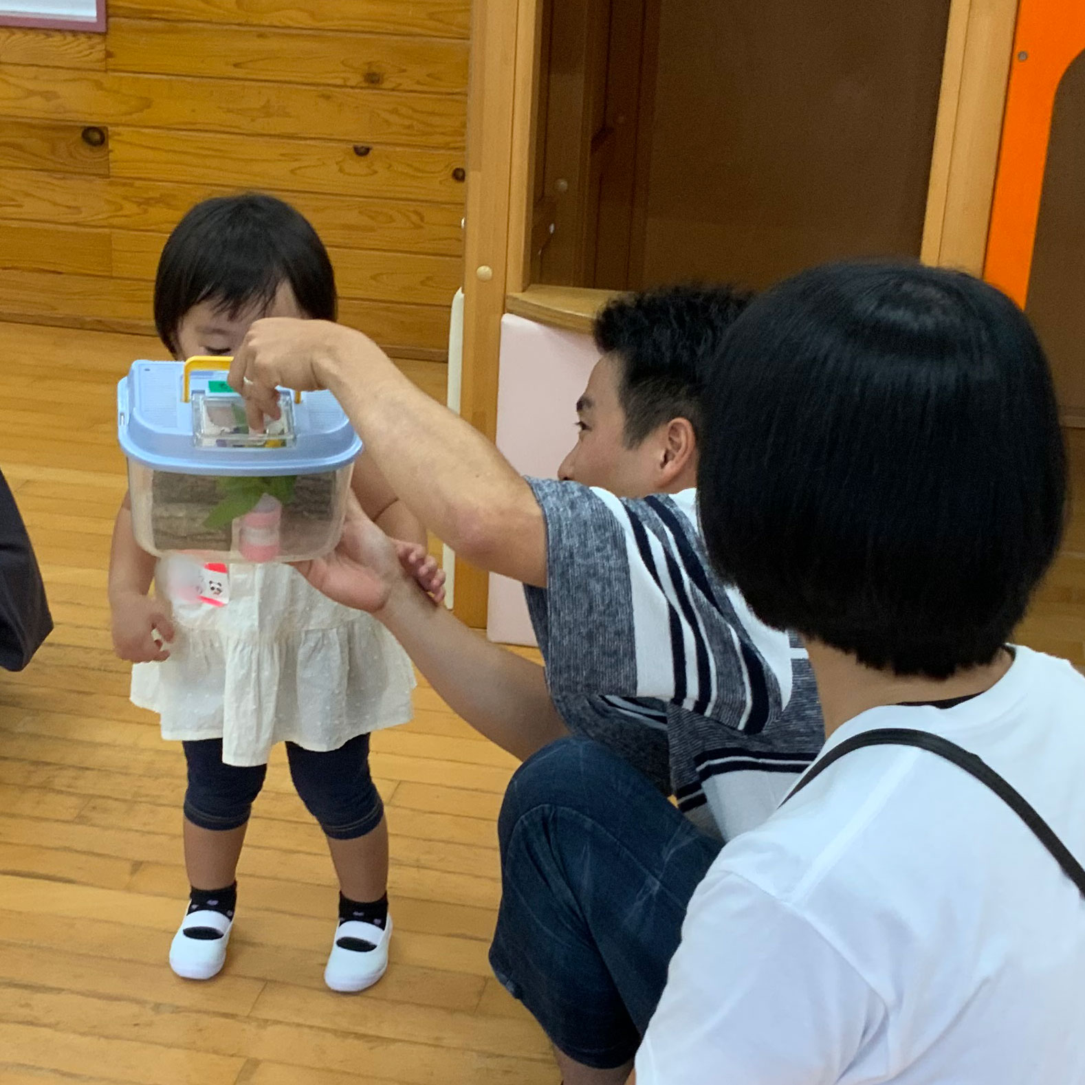 この日の絵本は『かまきりのこどもがうまれた』でした。幼稚園で見つけたカマキリもみんなでみましたよ。