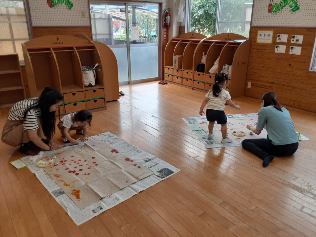 最初はスタンプとクレヨンを使って、大きな紙にお絵かきをしました。