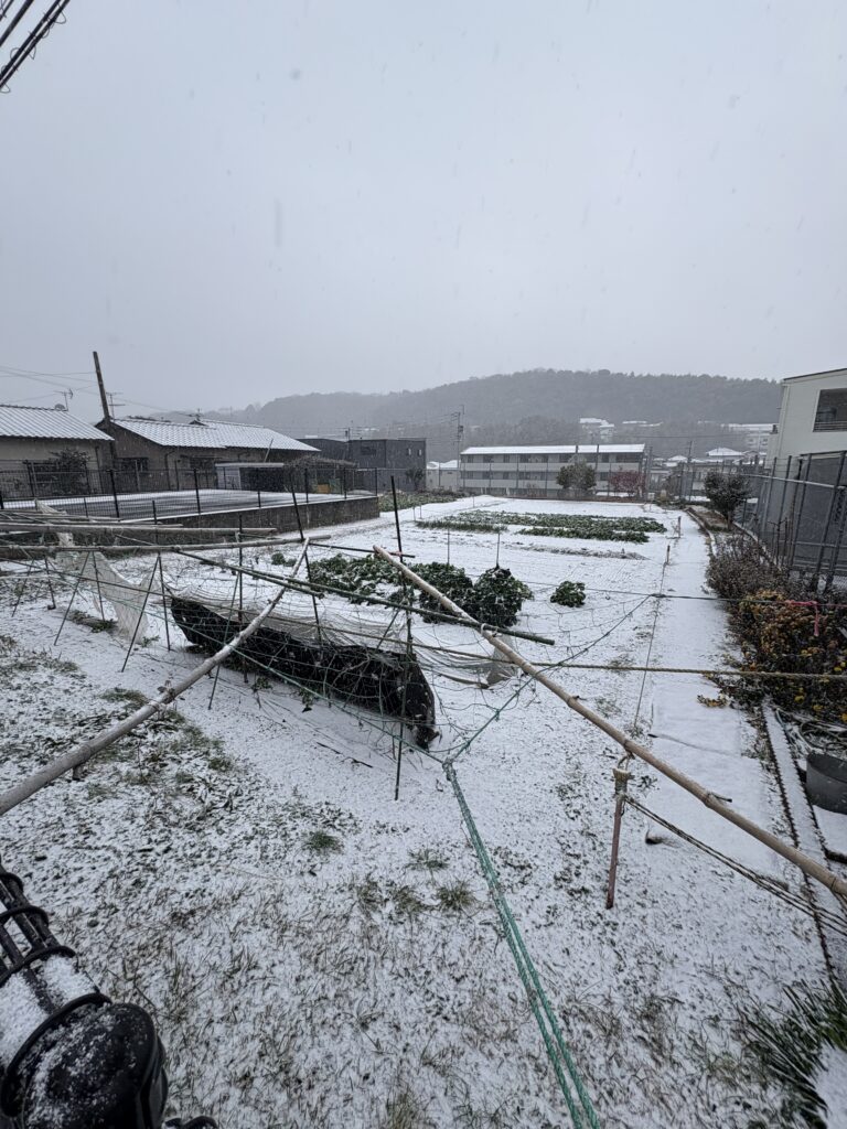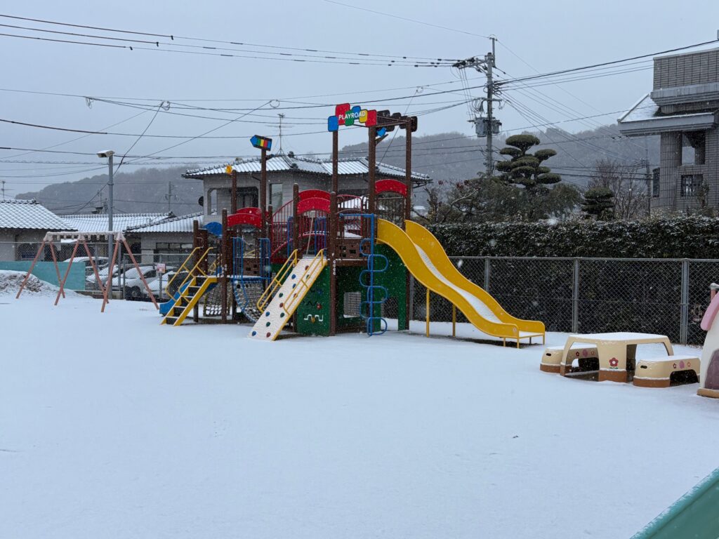 雪の中の静かな幼稚園。園庭も畑も真っ白です。
